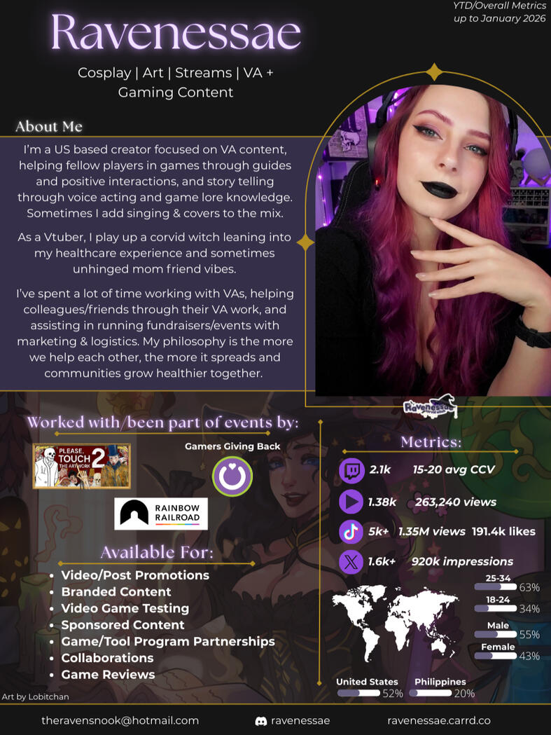 Howdy and welcome to the raven's nook!Let this witch VTuber, artist, content creator, singer, & game lore lover take you on an adventure, hmm?